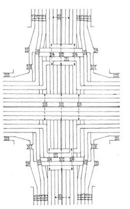 圖1是實用新型的橋體結(jié)構(gòu)圖路口的中間部位為縱向高架橋101,供縱向直行車輛通過路口,路口兩端架設(shè)縱向路面橋102(上起一高架車道),橫向中間直行車道103為雙盆形地下車道,縱向高架橋101下方隆起至地面,盆底部位上方為縱向路面橋102,車行道路不架設(shè)橋墩,縱向路面橋橋基(代橋墩)104、縱向高架橋橋基105(代橋墩)占用各轉(zhuǎn)彎掉頭車輛共用橫向車道路基??v向高架橋橋墩位于橫向道路中心線上所標101位置。