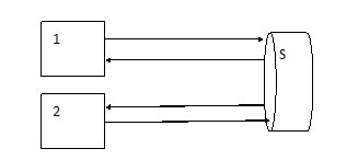 建立一個(gè)中心光交換節(jié)點(diǎn)S,有設(shè)備1、2,每個(gè)設(shè)備都有輸入和輸出兩條通訊鏈路與S連接,此時(shí)結(jié)構(gòu)圖如下。
