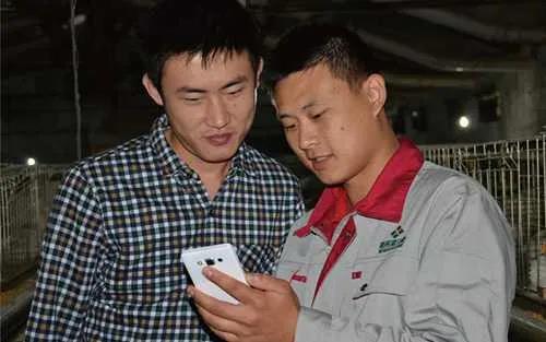 兩名養(yǎng)殖戶(hù)正在手機(jī)上操作新希望集團(tuán)推出應(yīng)用軟件(受訪(fǎng)者供圖)