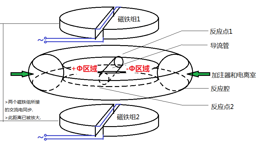 如圖, 兩組電磁鐵平行放置, 反應(yīng)腔夾于磁鐵之間. 每個電磁鐵組水平均分為兩半, 中間以狹縫隔開. 其線圈繞組使得在通交流電時兩半的磁場方向相反, 大小相同. 兩組電磁鐵通以同步高頻交流電, 于是就可以使兩組電磁鐵之間的半邊磁通量變化, 從而在反應(yīng)腔所在的位置產(chǎn)生渦旋電場. 兩邊的渦旋電場在反應(yīng)腔中部橫穿的導(dǎo)流管處疊加. 導(dǎo)流管兩端自然產(chǎn)生主、副對撞點(diǎn), 即反應(yīng)點(diǎn)1和2. 反應(yīng)腔內(nèi)同時還存在水平方向同軸的環(huán)形磁場(此點(diǎn)與托卡馬克相同), 用于約束粒子沿環(huán)形軌跡運(yùn)動, 并在反應(yīng)點(diǎn)處收緊以壓縮等離子體.