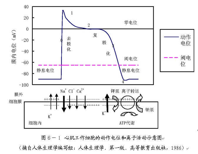 在上圖中,去極化(0期),心肌細胞受刺激后,靜息電位到達閾電位時,迅速激活鈉通道,使其開放,造成大量鈉離子內(nèi)流,動作電位迅速升高,鈉通道又迅速失活關(guān)閉;快速復(fù)極化初期(1期),鈉離子內(nèi)流停止,氯離子通透性升高,氯離子內(nèi)流,氯離子通道通透性也迅速下降;緩慢復(fù)極化期(2期),鈣離子緩慢內(nèi)流,與此同時,少量鉀離子外流,鈣離子通道的激活和失活過程均緩慢,故稱慢通道;快速復(fù)極化末期(3期),鉀離子外流;靜息期(4期),此期離子轉(zhuǎn)運活躍,即把動作電位形成期間流入膜內(nèi)的鈉離子,氯離子,鈣離子排出,又把外流的鉀離子攝回,這一過程通過心肌細胞膜上的Na+-K+泵的作用完成的,需要消耗ATP的生理過程。(本小節(jié)內(nèi)容摘自人體生理學編寫組:人體生理學.第一版.高等教育出版社,1986)