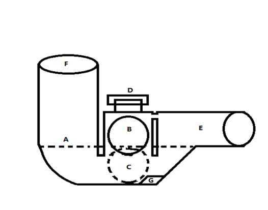 排水管的設計(如圖):本設計是在U型管道的基礎上增加固體阻斷機構(球形、圓柱形等多種形體),當U型管道中填充一定量的水時,機構內(nèi)的阻斷球就會在浮力的作用下,處于完全開放的狀態(tài),當U型管道內(nèi)的水因得不到及時補充而氣化,這時,B球體在重力作用下,隨著管內(nèi)水位下降而下落。在管道底部、球體下落方向增設斜面,增加球體下落壓力,增加球體密封效果。當管道內(nèi)補充一定的水量時,球體的水的浮力作用下,上浮到B區(qū),保持管道通暢。從而達到有效阻止有害物質回流的目的。