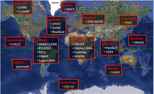 圖4 全世界暗物質(zhì)地下實驗分布(暗物質(zhì)直接探測)