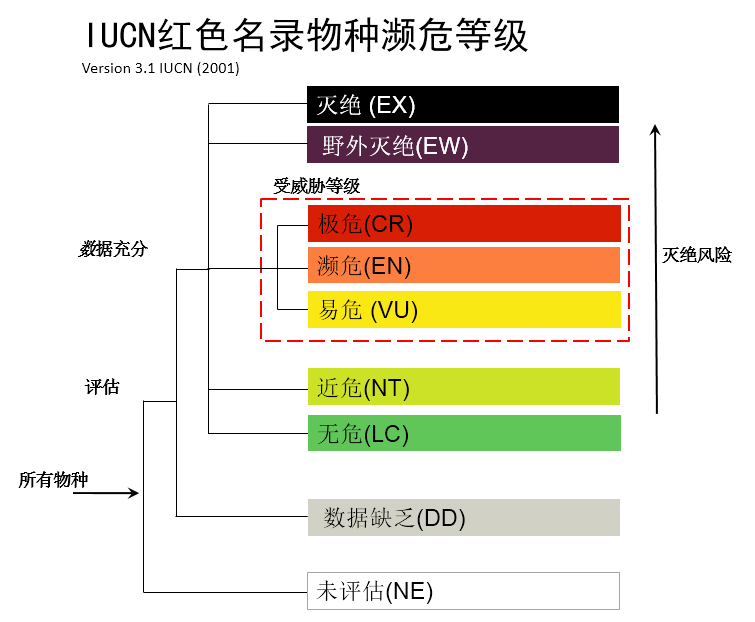 IUCN自20世紀(jì)60年代成立之日起,就設(shè)立了物種生存委員會(huì)(SSC),開始編制和印刷《IUCN瀕危物種紅皮書》,后來(lái)隨著評(píng)估物種的增加,印刷版逐步發(fā)展為網(wǎng)絡(luò)版的《IUCN瀕危物種紅色名錄》,定期編制發(fā)布。IUCN/SSC研究制定了《IUCN物種紅色名錄瀕危等級(jí)和標(biāo)準(zhǔn)》,根據(jù)物種的種群數(shù)量和分布情況等,評(píng)估其生存狀況,確定其瀕危等級(jí)。IUCN瀕危物種等級(jí)標(biāo)準(zhǔn)分為“有評(píng)估數(shù)據(jù)”和“數(shù)據(jù)缺乏”兩類,“有數(shù)據(jù)評(píng)估”中又分為“滅絕”、“野外滅絕”、“區(qū)域滅絕”、“極危”、“瀕?!?、“易?!?、“近?!焙汀盁o(wú)?!钡?個(gè)級(jí)別,從“無(wú)?!钡健皹O?!保瑴缃^風(fēng)險(xiǎn)逐步上升,瀕危等級(jí)逐步增加。瀕危等級(jí)標(biāo)準(zhǔn)有5個(gè)指標(biāo),分別是種群下降、有限地理分布區(qū)、下降小種群、非常小或非常有限的種群、以及模型模擬等量化分析,根據(jù)這些指標(biāo)的數(shù)量閾值,來(lái)評(píng)估物種的瀕危等級(jí)。