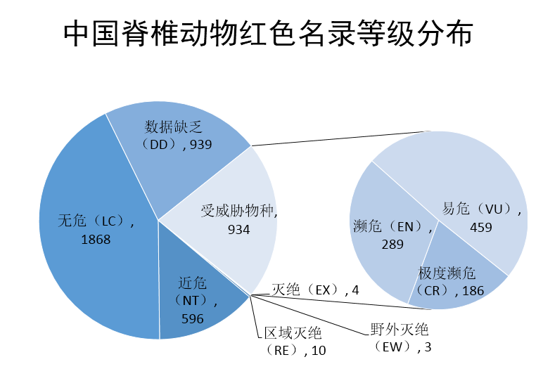 2015年完成的《中國(guó)生物多樣性紅色名錄-脊椎動(dòng)物卷》,共評(píng)估了中國(guó)4357種脊椎動(dòng)物,包括673種哺乳類,1372種鳥類,461種爬行類,408種兩棲類,1443種淡水魚類。其中939種數(shù)據(jù)缺乏,1868種無(wú)危,596種近危,受威脅的物種共934種。在934種受威脅物種當(dāng)中,易危459種,瀕危289種,極度瀕危186種。受威脅的原因分析中,過度利用、生境喪失和人類干擾是最主要的威脅因子。