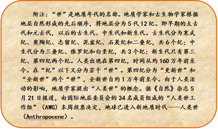 在2000年的一個(gè)國(guó)際會(huì)議上,1995年諾貝爾化學(xué)獎(jiǎng)得主保羅-克魯岑提出,當(dāng)今人類活動(dòng)對(duì)自然環(huán)境的影響已經(jīng)超過了自然狀態(tài)的變化,應(yīng)該定義一個(gè)新的地質(zhì)時(shí)代,叫人類世。我國(guó)科學(xué)家劉東生院士參加了此會(huì),回國(guó)后就極力推薦這個(gè)詞。