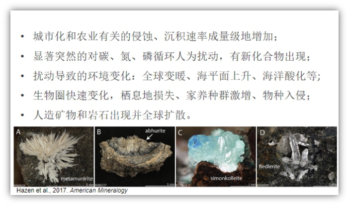 國(guó)際地層委員會(huì)的人類世工作組工作了10年,總結(jié)了一些現(xiàn)象,如城市化和農(nóng)業(yè)的侵蝕、沉積速率成量級(jí)地增加,顯著而突然的對(duì)碳、氮、磷循環(huán)的人為擾動(dòng),產(chǎn)生一些新的化合物,使得生物圈出現(xiàn)快速變化、棲息地的損失帶來植物多樣性的降低、馴化生物種群大規(guī)模增加,人類的遷徙活動(dòng)等等。