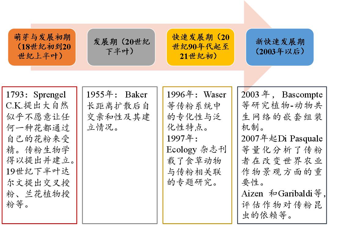 由于傳粉昆蟲的重要性以及目前所面臨的危機已經(jīng)引起科學(xué)家和民眾的廣泛關(guān)注。諸多地區(qū)級、國家級乃至全球級別的傳粉研究已經(jīng)取得了階段性的成果。就全球范圍來說,傳粉昆蟲的研究主要包括四個時期,分別為:1)萌芽與發(fā)展初期(18世紀(jì)初到20世紀(jì)上半葉);2)發(fā)展期(20世紀(jì)下半葉);3)快速發(fā)展期(20世紀(jì)90年代起至21世紀(jì)初);4)新快速發(fā)展期(2003年以后)。