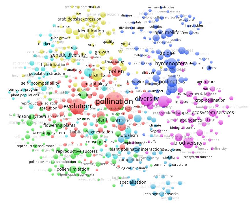與此同時我們還通過ESI對pollination和pollinator等關(guān)鍵詞進(jìn)行檢索,可以大致得出傳粉昆蟲研究領(lǐng)域的現(xiàn)有研究前沿如下:1)常用新煙堿類殺蟲劑對蜜蜂的殺傷作用;2)野生授粉昆蟲對農(nóng)業(yè)增收和作物健康的積極影響;3)傳粉昆蟲種群測量與評估;4)花朵與傳粉昆蟲的生態(tài)聯(lián)系。通過利用Vos Viewer軟件繪制傳粉生物學(xué)關(guān)鍵詞共現(xiàn)(co-occurrence)聚類圖,獲得傳粉生物學(xué)領(lǐng)域的研究熱點包括:1)傳粉昆蟲的形態(tài)學(xué)、系統(tǒng)進(jìn)化、分類學(xué)方面的研究;2)傳粉昆蟲介導(dǎo)的植物繁殖、選育、選種等的研究,以及花粉限制對傳粉昆蟲的影響;3)殺蟲劑導(dǎo)致傳粉昆蟲,尤其是蜜蜂、熊蜂的種群下降的影響;4)傳粉昆蟲介導(dǎo)的植物基因表達(dá)、生長、增產(chǎn)等;5)景觀變化、城市化等環(huán)境因素導(dǎo)致生物多樣性降低、傳粉服務(wù)功能下降、傳粉昆蟲群體數(shù)量下降等影響評估,并提出相關(guān)的控制與管理措施;6)植物-傳粉昆蟲互作與共生、植物與傳粉昆蟲形成的生態(tài)網(wǎng)絡(luò)結(jié)構(gòu)等方面的研究;7)傳粉使植物基因流擴散,使植物基因變異和多樣性。
