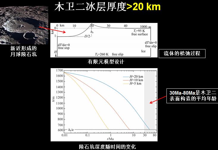 冰層厚度很重要:厚的冰層可能發(fā)生對(duì)流,有利于表面與水的連通;過(guò)薄的冰層不利于對(duì)流的發(fā)生,限制了表面與水的連通。動(dòng)力學(xué)數(shù)值模擬揭示:木衛(wèi)二冰層厚度大于20km。