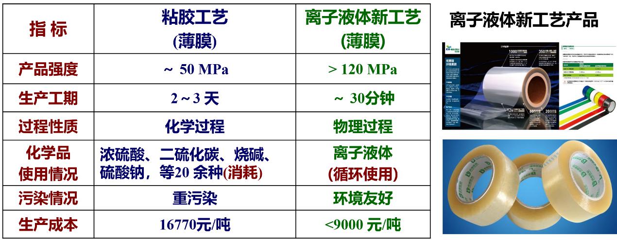 以前纖維素制膜工藝污染很大,中國(guó)逐漸在關(guān)停。而我們的離子液體工藝是物理溶解,基本沒(méi)有污染。原來(lái)工藝需要三天時(shí)間,現(xiàn)在三十分鐘就做出來(lái)了(圖8)。在車(chē)間里面都聞不到氣味,火都點(diǎn)不著,非常安全。其中溶劑是我們的專(zhuān)利,包括后面的溶劑回收,溶劑是可以回收再反復(fù)利用的。用我們這個(gè)工藝與企業(yè)合作建立了生產(chǎn)線,2019年基本已經(jīng)建成了,今年11月底試車(chē)。生產(chǎn)的產(chǎn)品推薦在快遞物流上使用,特別是用低成本秸稈做的膠帶,有很好的應(yīng)用前景。